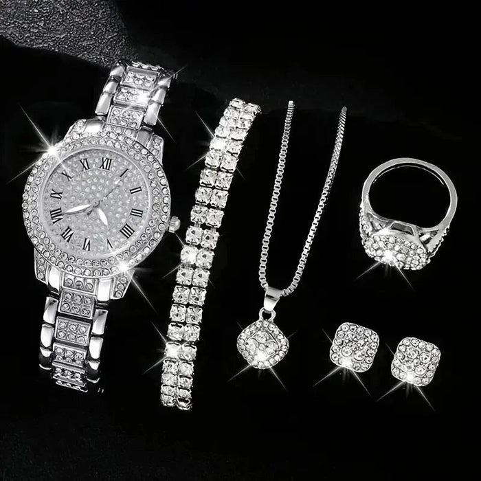 Women's Silvery Watch Ring Necklace Earrings Bracelet Set Rhinestone Fashion Wristwatch Female Casual Ladies Quartz Watches